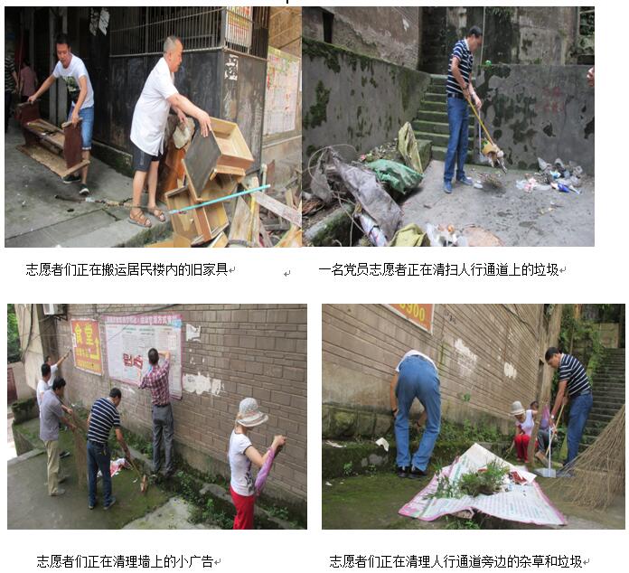 上午八点半,党员志愿者们拿着劳动工具早早地来到大扫除现场,他们不怕脏、不怕累,重点对两个社区内的老旧居民楼院、人行通道等区域内堆放的旧家具、杂物、白色污染物等陈旧垃圾进行搬运和清理,还对社区墙面上的小广告进行铲除。