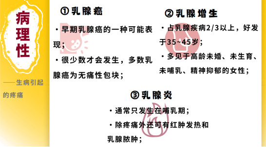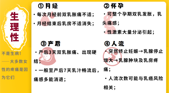 1.经前乳房胀痛 有半数以上的妇女在月经来临前有双乳胀痛或不适感,月经之后,胀痛也跟着消失了,对此不需要太过在意,保持心情开朗,精神放松即可。 2.孕期乳房胀痛 怀宝宝的时候乳房会有很胀的感觉。这是由于相关的性激素大量分泌造成的,是正常现象。 3.产后乳房胀痛 母亲为了给刚出生的宝宝哺乳,身体会产生一定的变化,可能会感觉乳房胀痛,一般在能正常哺乳后就不会有明显痛感。 4.人流后乳房胀痛 人流后,原本准备为宝宝提供母乳的乳房就会被强制中断,造成乳房疼痛。据相关报道,人流次数越多,患乳癌的危险性越大。 (二)病理性-疾病造成的疼痛