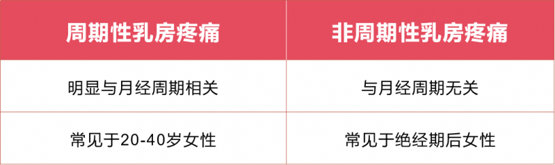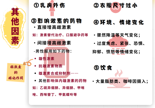1.乳腺癌 乳房疼痛可能是早期乳腺癌的一种表现,但是大多数乳房疼痛与乳腺癌相关性不大,无需过度害怕。 2.乳腺增生性乳房痛 乳腺增生症是乳腺组织增生及退行性病变,与内分泌功能紊乱密切相关,也是大多数乳房疼痛的"罪魁祸首",35~45岁妇女较常见,尤其是还没有生宝宝的高龄女性。 3.乳腺炎 哺乳期乳腺炎是产褥期常见的一种疾病,常见表现为乳房疼痛性肿块合并局部红肿发热的症状。 4.着衣尺寸不合适 内衣尺寸不合适,比如过紧可能也会导致乳房疼痛。 5.药物 一些药物也会对乳房产生刺激,雌激素制剂如口服避孕药、补佳乐等激素制剂会对乳房产生刺激。对男性而言,由于睾酮可在芳香酶作用下向雌激素转化,雄激素过高时雌激素产生也会增多,进而间接对乳房造成刺激。男性服用雄性激素和合成代谢类固醇、抗雄激素物质或雄激素合成抑制剂、及乙硫异烟肼、异烟肼、甲哨唑、西咪替丁、甲氨蝶呤等影响体内雄激素的药物也可造成乳房疼痛。 (三)其它因素:情绪及饮食