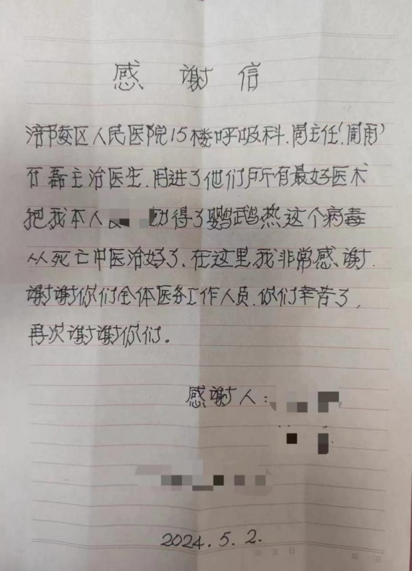 转科后,医生考虑患者系重症肺炎,予以抗感染、无创呼吸机辅助通气治疗,但患者咳嗽、发热及活动后气促症状无明显改善,随访血气分析提示氧合指数进行性下降,最低时氧合指数仅80左右。因患者病情危重,科室主任、副主任医师周雨在查房评估病情并与患者家属充分沟通后于4月8日行气管插管、有创呼吸机辅助通气治疗,复查胸部CT提示肺部炎症较前进展,胸腔积液也较前增多,遂立即行纤维支气管镜检查留取肺泡灌洗液送检mNGS,4月10日肺泡灌洗液mNGS结果提示:检测出鹦鹉热衣原体,序列数2078。科室立即调整为多西环素联合莫西沙星继续抗感染,继续有创呼吸机机械辅助通气,并辅以俯卧位通气、纤支镜床旁灌洗等治疗,患者体温逐渐控制,复查胸部CT提示肺部病变逐渐吸收,血气分析提示氧合指数逐渐上升至300左右,于4月19日顺利拔管、停用有创呼吸机,予以序贯脱机治疗。4月29日复查胸部CT提示右肺病变明显吸收,胸腔积液减少,患者在不吸氧情况下已能自理生活,无明显活动后的气促表现。患者于4月30办理出院并口服抗感染药物以继续治疗。患者及其家属对该科的治疗效果非常满意,特亲笔书写感谢信对科室主任周雨及全科医务人员表达最诚挚的谢意。