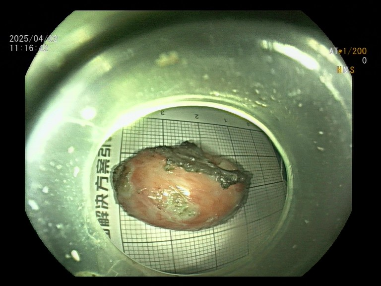切除的肿瘤 本次手术的难度堪称“极限挑战”。患者体内的肿瘤位于食管中段,外侧紧邻主动脉弓——这一区域堪称内镜手术的“高危禁区”。此处食管壁厚度仅数毫米,且紧邻心脏大血管,而肿瘤体积较大,任何细微操作失误都可能引发致命性大出血。患者因肿瘤复查显示增大,并伴有明显的吞咽哽咽感,急需切除肿瘤以明确性质。传统开胸手术不仅需要切断肋骨,创伤极大,且术后恢复周期漫长,给患者带来极大痛苦与负担。