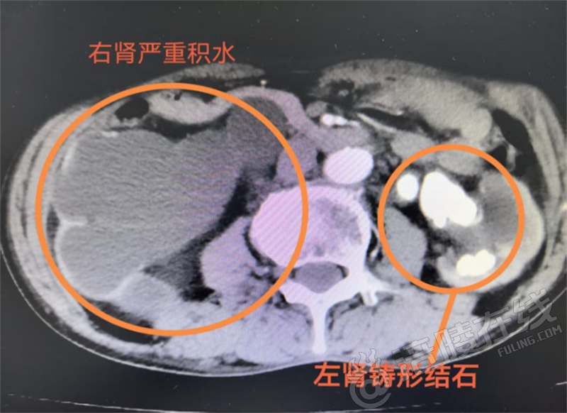 72岁的何大爷在体检胸部CT时,发现肾脏异常,呈现囊性扩张,考虑为双肾积水,随后入住泌尿与小儿外科,行腹部CT后发现右侧输尿管结石致右肾重度积水,右肾实质明显菲薄,考虑右肾已无功能,左肾多发结石致左肾重度积水导致功能性孤立肾(功能性孤立肾指仅剩一个有功能的肾脏,需格外保护)。患者由于年龄大、心脏基础病重,二尖瓣、三尖瓣重度反流,手术风险高。面对这一情况,科室经多学科会诊后,决定采取“分期经皮肾镜碎石术”的治疗方案,分两次进行左侧经皮肾镜碎石取石术。“患者属于高风险复杂性结石,患者的手术耐受性差,分期手术既能控制单次操作的时长和风险,又能逐步改善肾功能。”杨川说道。